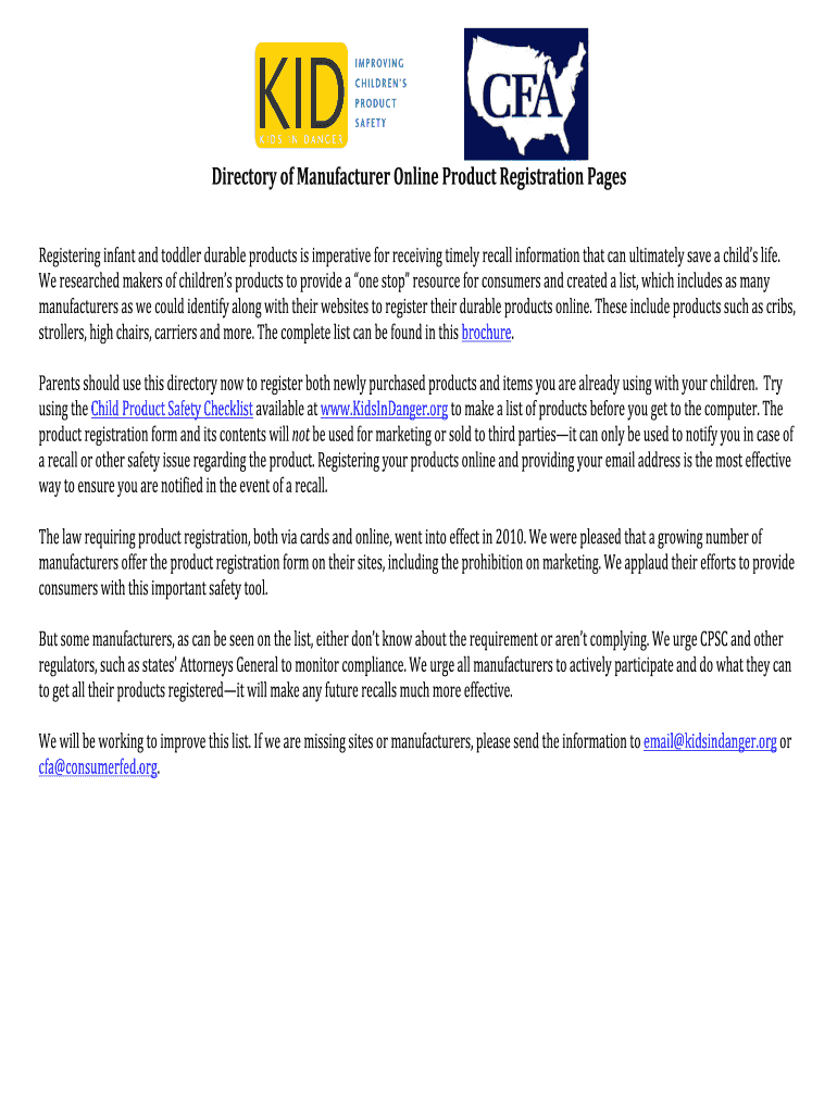 Get the free Directory of Manufacturer Online Product Registration Pages.docx