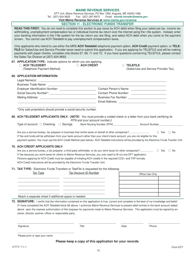 While specific deadlines can vary, it is recommended to submit the Maine EFT Application Form as early as possible to ensure timely processing of your tax payments. Check with Maine Revenue Services for any specific filing deadlines.