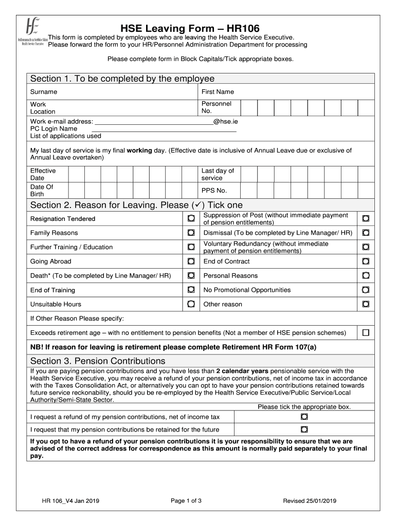 HSE Leaving Form HR106This form is completed by employees who are leaving the Health Service Executive. Please forward the form to your HR/Personnel Administration Department for processing Please