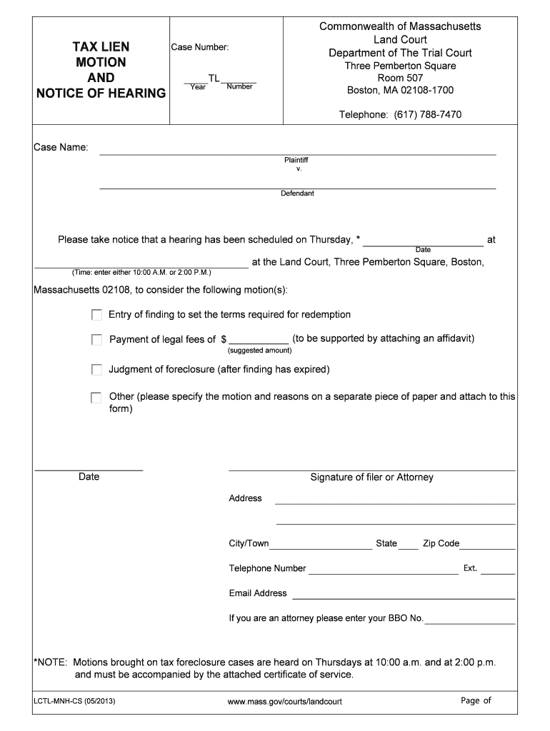 Get the free Tax Lien Motion and Notice of Hearing (with Certificate ... - Mass.Gov