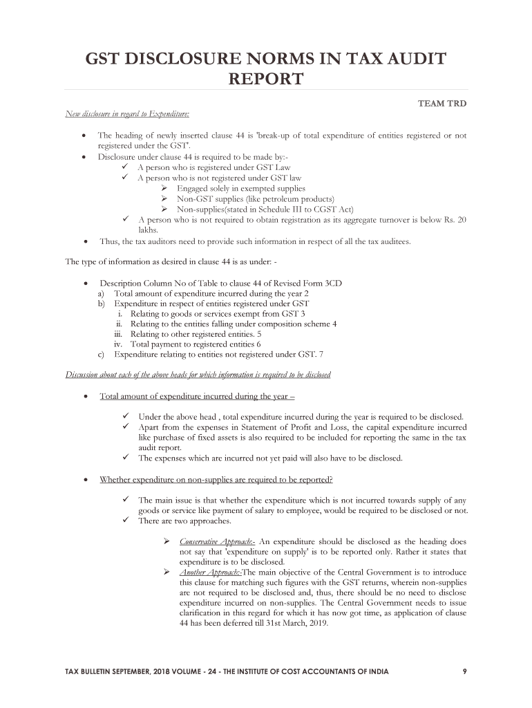 GST DISCLOSURE NORMS IN TAX AUDIT REPORT New disclosure in regard to Expenditure: TEAM Truth heading of newly inserted clause 44 is 'breakup of total expenditure of entities registered or not registered