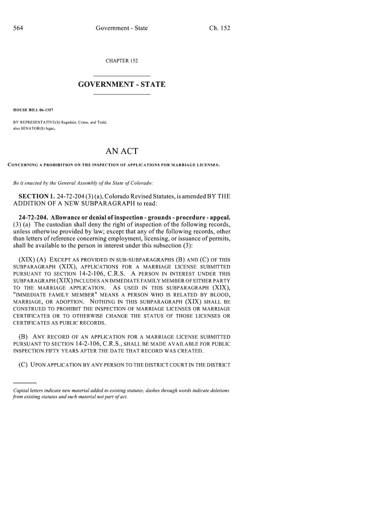 Government - State Ch* 152 CHAPTER 152 GOVERNMENT - STATE HOUSE BILL 06-1357 BY REPRESENTATIVE S Ragsdale Crane and Todd also SENATOR S Isgar. AN ACT C O N C ER N IN G A P R OHIB IT ION ON THE INSPECTION OF APPLICATIONS FOR M A R R IA GE LIC EN SES. Be it enacted by the General Assembly of the State of Colorado SECTION 1. 24-72-204 3 a Colorado Revised Statutes is amended BY THE ADDITION OF A NEW SUBPARAGRAPH to read 24-72-204. Allowance or denial of inspection - grounds - procedure -...