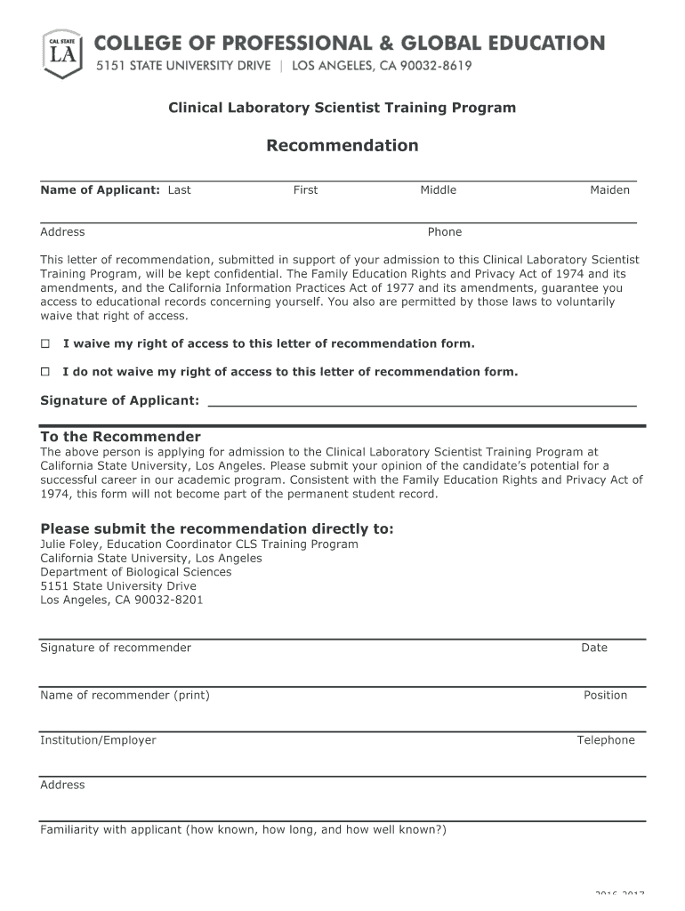 Clinical Laboratory Scientist Training ProgramRecommendation Name of Applicant: Last First Middle Maiden Address Phone This letter of recommendation, submitted in support of your admission to this