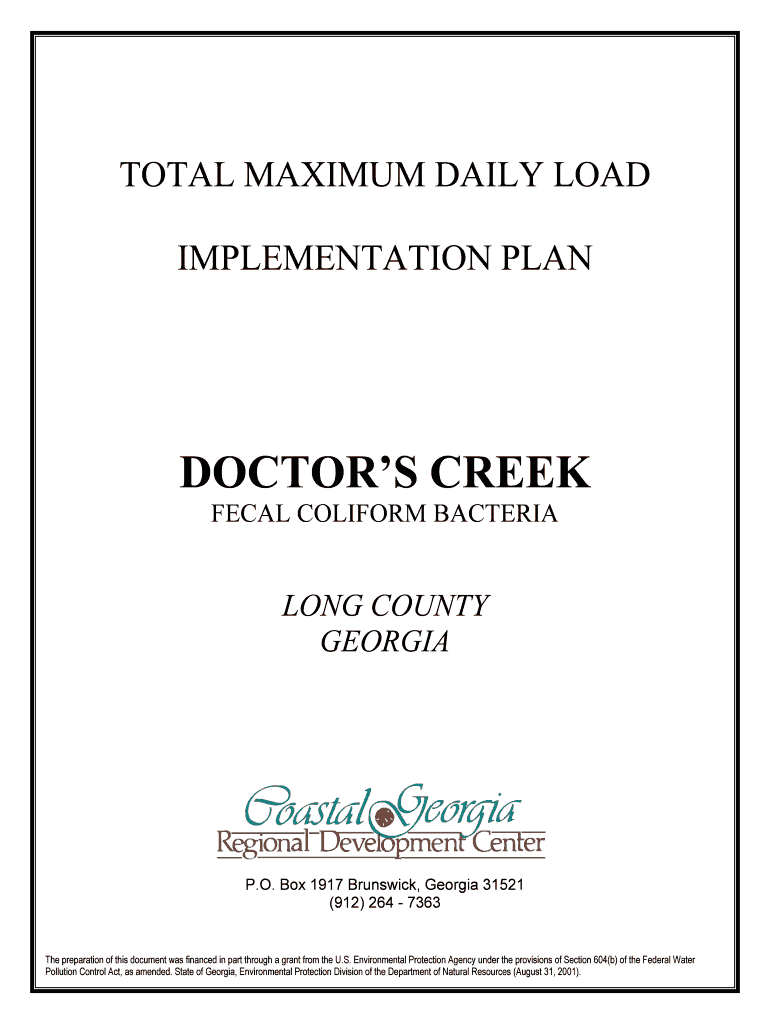 TOTAL MAXIMUM DAILY LOAD IMPLEMENTATION PLAN DOCTOR S CREEK FECAL COLIFORM BACTERIA LONG COUNTY GEORGIA P.O. Box 1917 Brunswick, Georgia 31521 (912) 264 7363 The preparation of this document was financed