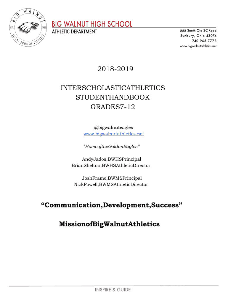 20182019 INTERSCHOLASTIC ATHLETICS STUDENT HANDBOOK GRADES 712 bigwalnuteagles www.bigwalnutathletics.net Home of the Golden Eagles Andy Jades, BHS Principal Brian Shelton, BHS Athletic Director Josh