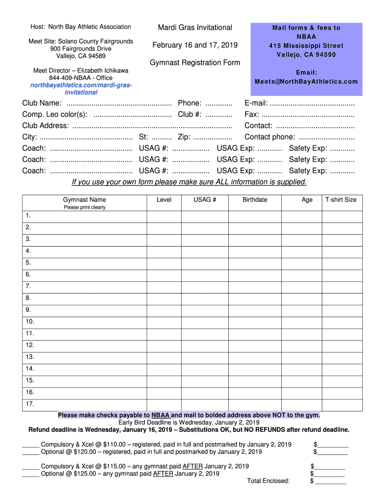 Host: North Bay Athletic Association Meet Site: Solano County Fairgrounds 900 Fairgrounds Drive Vallejo, CA 94589Mail forms & fees to NCAA 415 Mississippi Street Vallejo, CA 94590Mardi Gas Invitational
