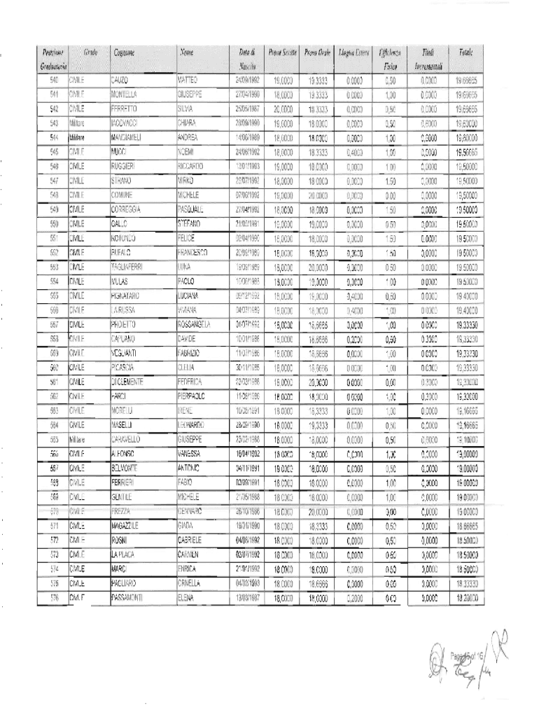 Grade Posiziolle Gladiatorial CIVIL 540 541 CIVIL 542 543CIVILECogllome CAU ZO MANTILLA FERRET TO IACOVACCINomeData DI Fascia 24/09/1992 27/04/1990Prova Scritta25/05/198720,0000CHIARA ANDREA28/09/199019,000014/06/198918,0000NOEMI24/06/1992RICCARDO