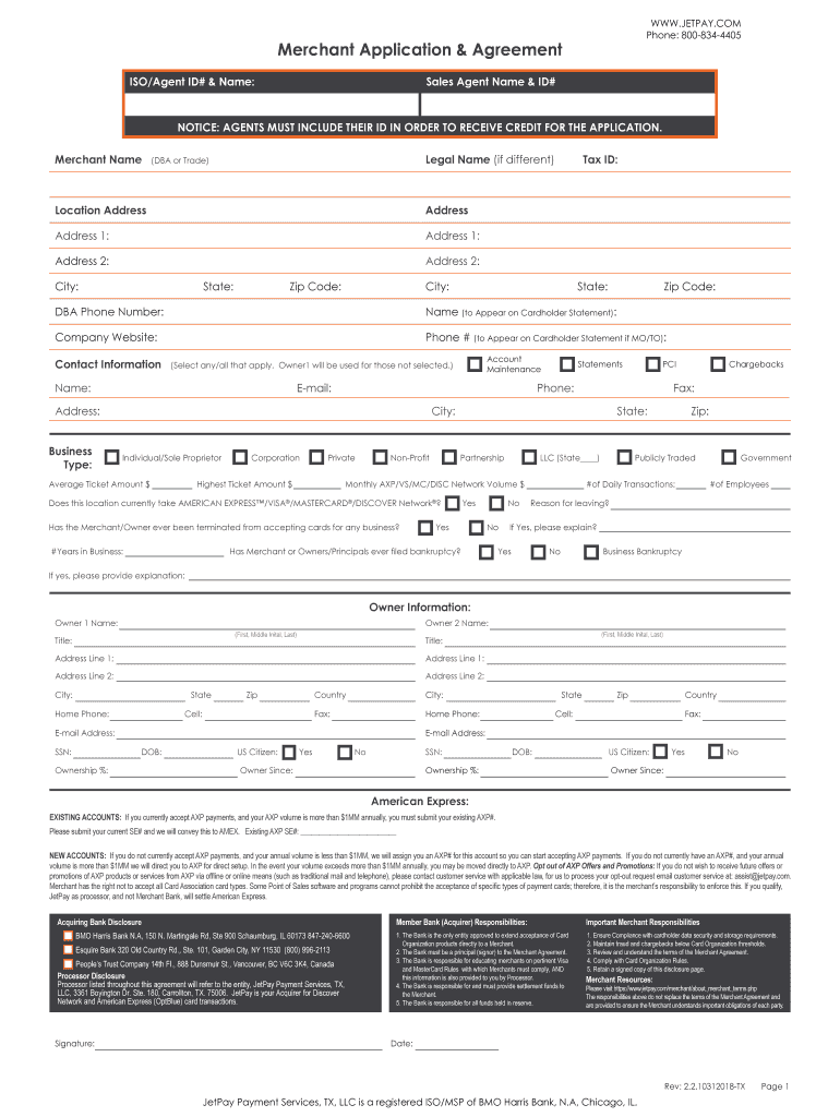 WWW.JETPAY.COM Phone: 8008344405Merchant Application & Agreement ISO/Agent ID# & Name:Sales Agent Name & ID×NOTICE: AGENTS MUST INCLUDE THEIR ID IN ORDER TO RECEIVE CREDIT FOR THE APPLICATION. Merchant