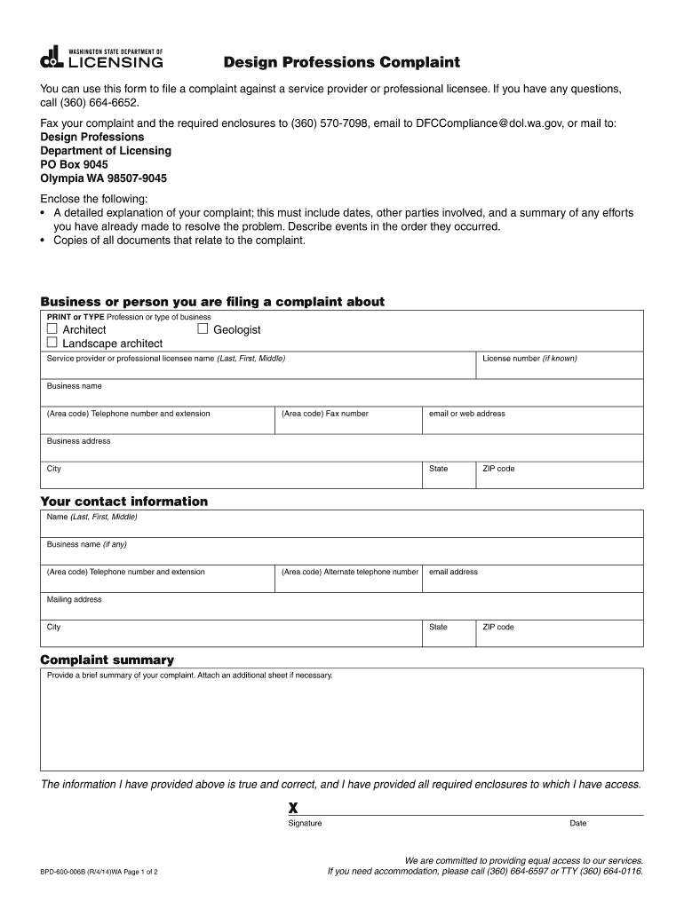 The Design Professions Complaint Form is a legal document used by individuals in Washington to file complaints against service providers or professional licensees.
