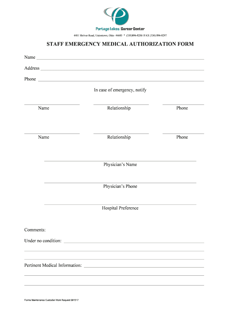 4401 Shiver Road, Uniontown, Ohio 44685 * (330)8968200 /FAX (330) 8968297STAFF EMERGENCY MEDICAL AUTHORIZATION FORM