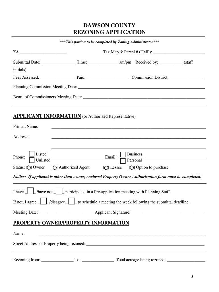 To fill out a Dawson County rezoning application, the applicant must provide detailed information about the current zoning designation, proposed zoning designation, reasons for the requested change, and potential impact on the surrounding area.