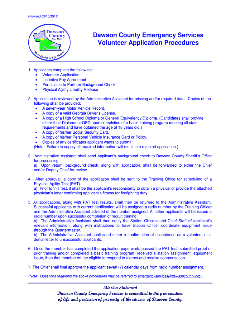 (Revised 03/15/2011) Dawson County Emergency Services Volunteer Application Procedures 1. Applicants complete the following: Volunteer Application Incentive Pay Agreement Permission to Perform Background
