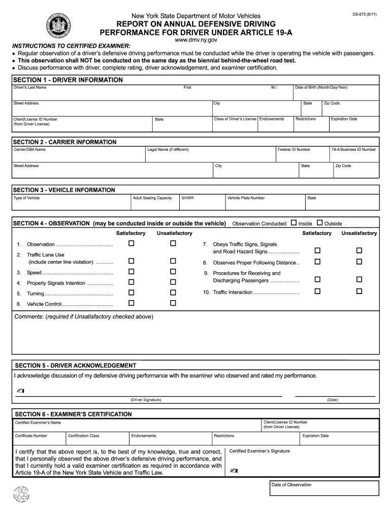 DS-873 (6/11) New York State Department of Motor Vehicles REPORT ON ANNUAL DEFENSIVE DRIVING PERFORMANCE FOR DRIVER UNDER ARTICLE 19-A www.dmv.ny.gov INSTRUCTIONS TO CERTIFIED EXAMINER: l Regular