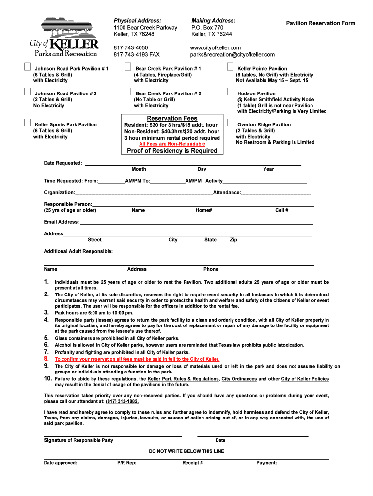Physical Address: 1100 Bear Creek Parkway Keller, TX 76248Mailing Address: P.O. Box 770 Keller, TX 762448177434050 8177434193 Fax.cityofkeller.com parks&recreation cityofkeller. Competition Reservation