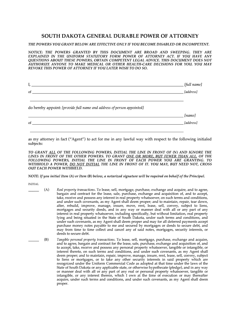 SOUTH DAKOTA GENERAL DURABLE POWER OF ATTORNEY