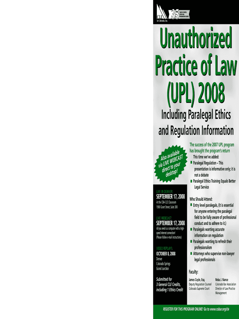 Unauthorized Practice of Law Register by PHONE... when using VISA or FAX... By Denver: (303) 860-0608 Toll-Free: Or MasterCard. In PHONE... (888) 860-2531 Or MAIL form to... CLE in Colorado St., Suite