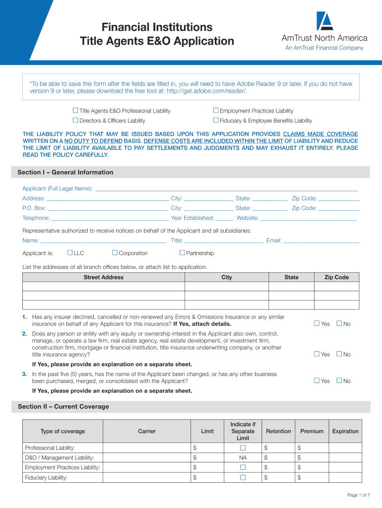 Financial Institutions Title Agents E&O Application×To be able to save this form after the fields are filled in, you will need to have Adobe Reader 9 or later. If you do not have version 9 or later,