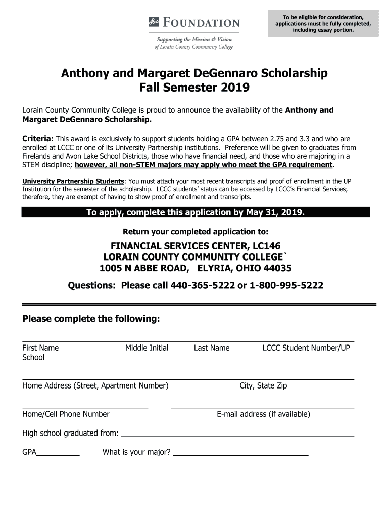To be eligible for consideration, applications must be fully completed, including essay portion. Anthony and Margaret Legendary Scholarship Fall Semester 2019 Lorain County Community College is proud