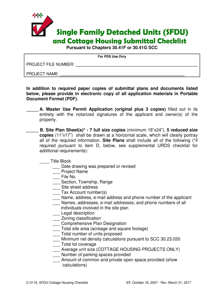 Single Family Detached Units (SFU) and Cottage Housing Submittal Checklist Pursuant to Chapters 30.41F or 30.41G SCC For PDS Use OnlyPROJECT FILE NUMBER: PROJECT NAME:In addition to required paper