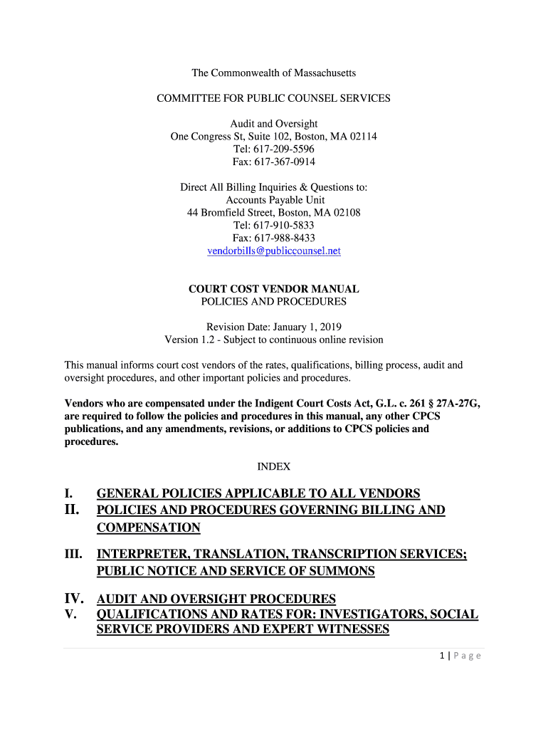 The Commonwealth of Massachusetts COMMITTEE FOR PUBLIC COUNSEL SERVICES Audit and Oversight One Congress St, Suite 102, Boston, MA 02114 Tel: 6172095596 Fax: 6173670914 Direct All Billing Inquiries