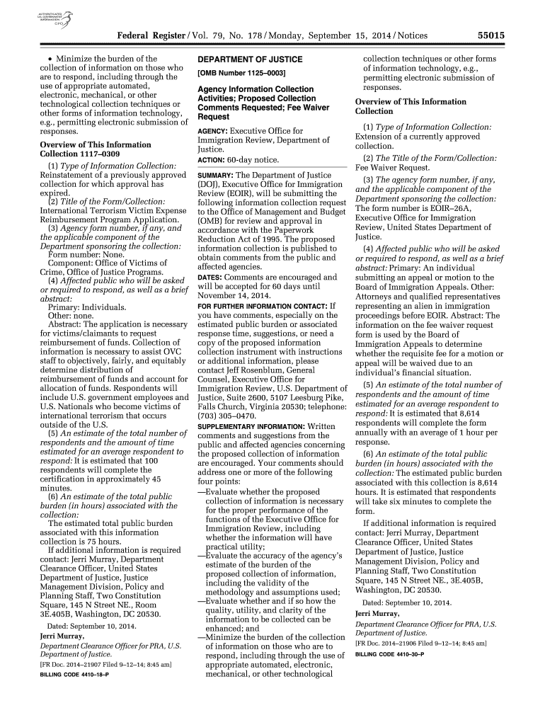 Federal Register / Vol. 79, No. 178 / Monday, September 15, 2014 / Notices Kelley on DSK3SPTVN1PROD with NOTICES Minimize the burden of the collection of information on those who are to respond, including