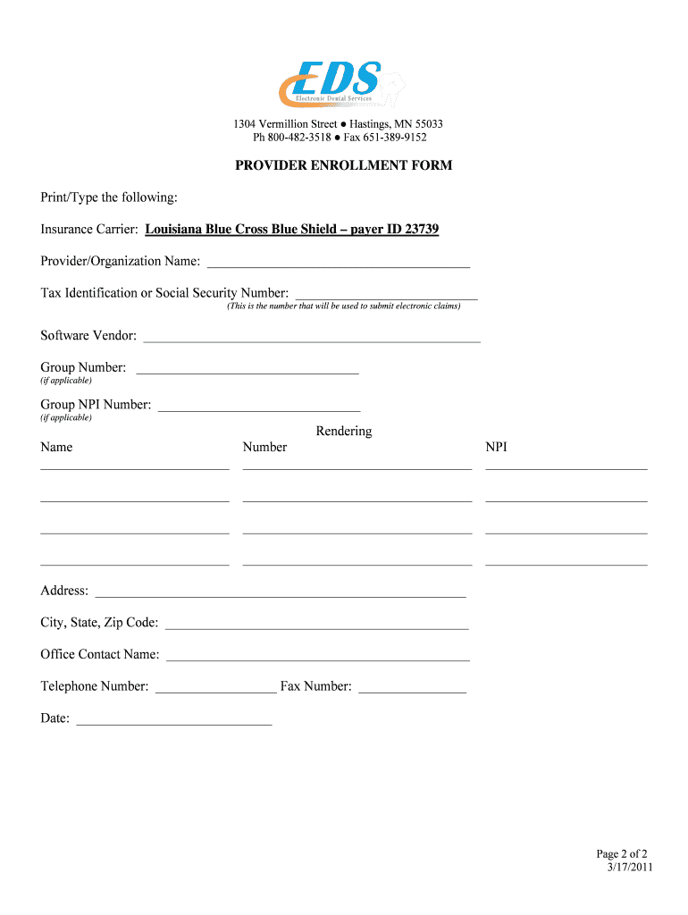 1304 Vermilion Street ? Hastings, MN 55033 pH 800-482-3518 ? Fax 651-389-9152 LOUISIANA BLUE CROSS BLUE SHIELD DENTAL ELECTRONIC CLAIMS ENROLLMENT REGISTRATION PAYER ID NUMBER ELECTRONIC REGISTRATIONS