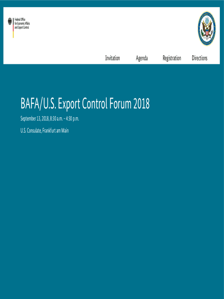 InvitationAgendaBAFA/U.S. Export Control Forum 2018 September 13, 2018, 8:30 a.m. 4:30 p.m. U.S. Consulate, Frankfurt am MainRegistrationDirectionsInvitationInvitation This year the German Federal