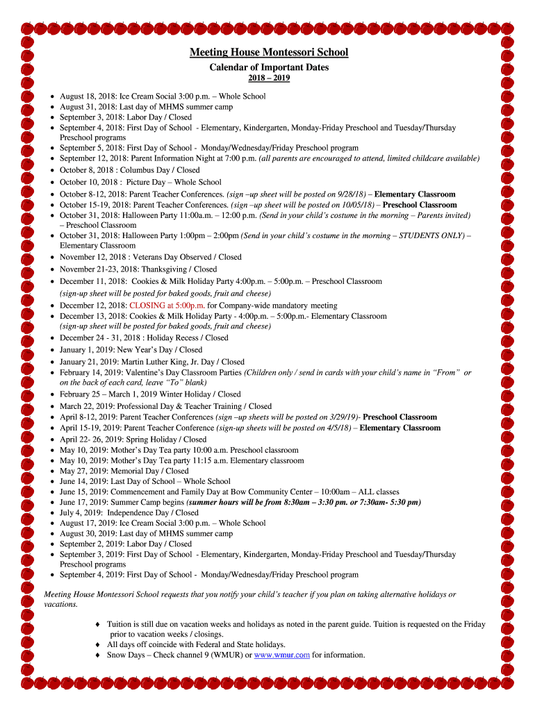 Meeting House Montessori School Calendar of Important Dates 2018 2019 August 18, 2018: Ice Cream Social 3:00 p.m. Whole School August 31, 2018: Last day of MMS summer camp September 3, 2018: Labor