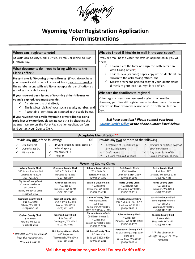 INSTRUCTIONS FOR COMPLETING & SUBMITTING VOTER REGISTRATION APPLICATION FORM YOU MAY USE THIS FORM TO: REGISTER TO VOTE IN WYOMING OR TO CHANGE YOUR REGISTRATION (NAME, ADDRESS OR PARTY) Register