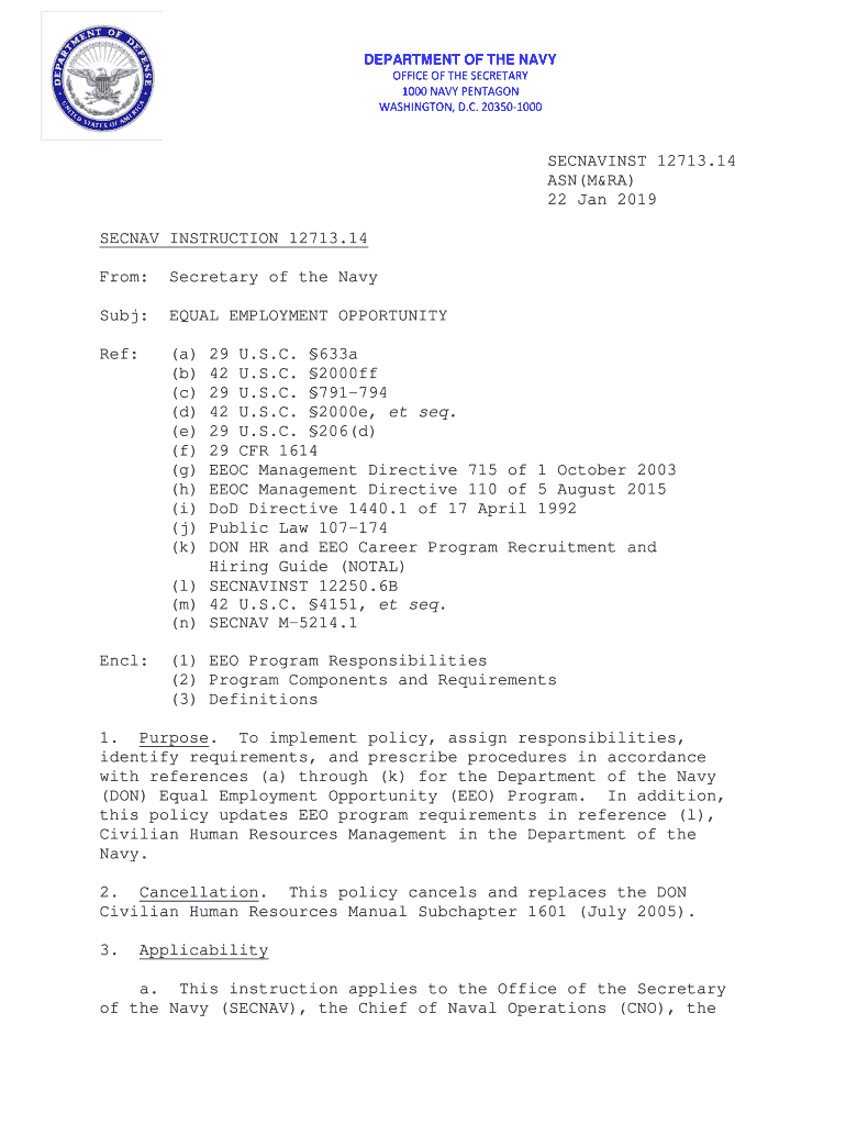 DEPARTMENT OF THE NAVY OFFICE OF THE SECRETARY 1000 NAVY PENTAGON WASHINGTON, D.C. 203501000SECNAVINST 12713.14 ASN(MARA) 22 Jan 2019 SECAM INSTRUCTION 12713.14 From:Secretary of the NavySubj:EQUAL