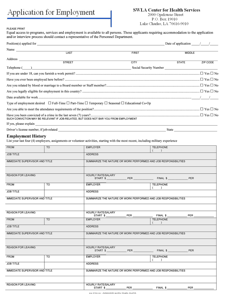 The Employment Application Form is designed with user-friendliness in mind, featuring various fillable fields and checkboxes that guide the applicant through the completion process. Each required field is marked clearly, and explicit instructions are provided to assist users in accurately filling out the form.