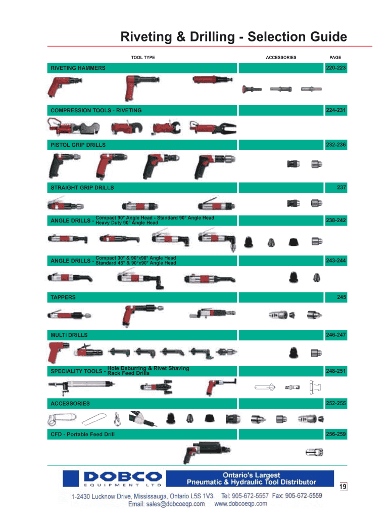 Riveting & Drilling Selection Guide TOOL TYPEACCESSORIESPAGERIVETING HAMMERS220223COMPRESSION TOOLS RIVETING224231PISTOL GRIP DRILLS232236STRAIGHT GRIP DRILLS237Compact 90 Angle Head Standard 90 Angle