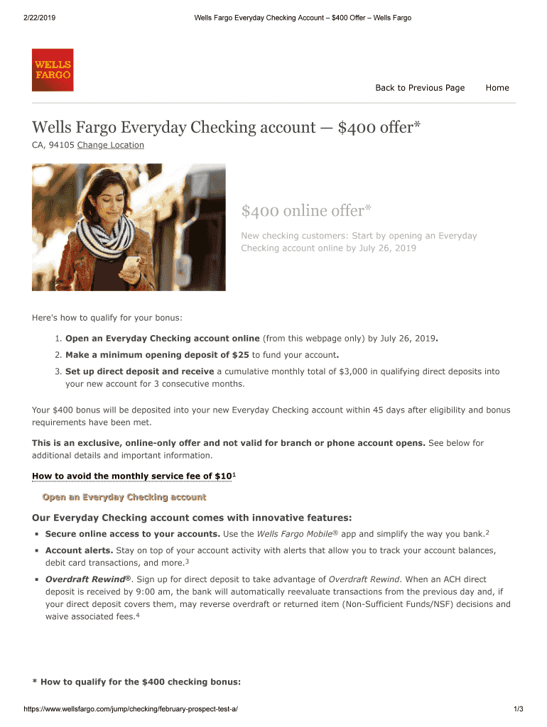 2/22/2019Wells Fargo Everyday Checking Account $400 Offer Wells Hardback to Previous PageHomeWells Fargo Everyday Checking account $400 offer* CA, 94105 Change Location×400 online offer* New checking