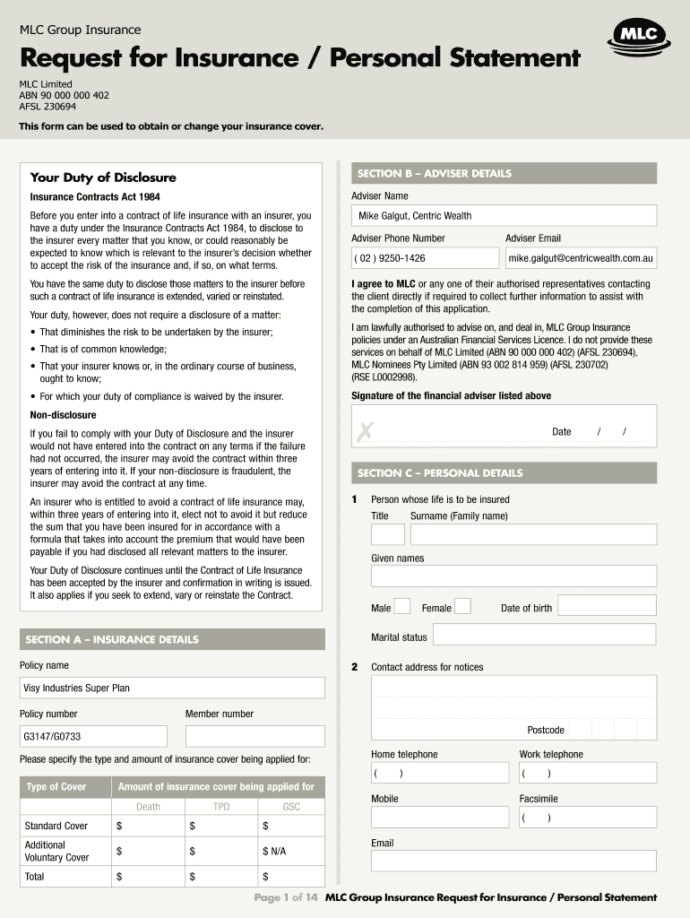 The MLC Group Insurance Request for Insurance is a vital form designed for acquiring or modifying insurance coverage. This form plays a crucial role in ensuring applicants can effectively secure their desired insurance policies. Under the Insurance Contracts Act 1984, applicants must disclose pertinent information, which underscores their duty of disclosure. Understanding the implications of this duty is essential for compliance.