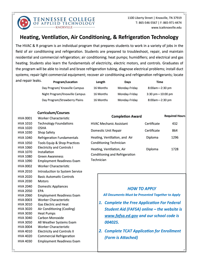 1100LibertyStreet Knoxville,TN37919 T:8655465567 F:8659714474 www.tcatknoxville.eduHeang, Venison, Air Condoning, & Refrigeration Technology TheHVAC&Rprogramisanindividualprogramthatpreparesstudentstoworkinavarietyofjobsinthe