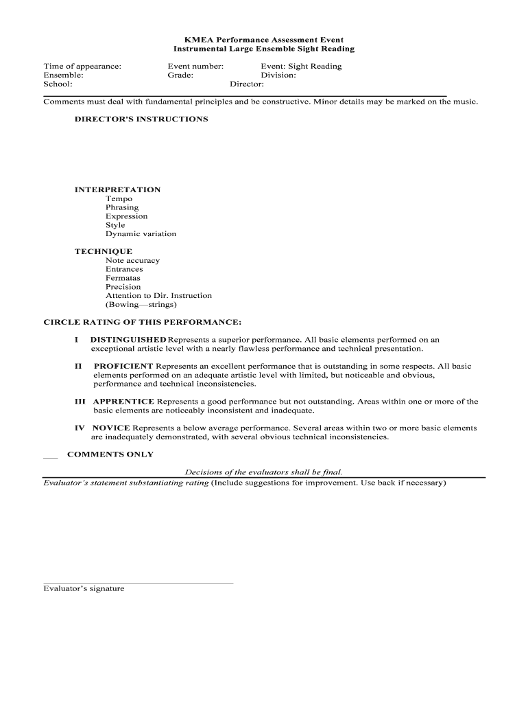 The KMEA Performance Assessment Event serves as a vital tool in evaluating instrumental ensembles through structured feedback. This process not only encompasses performance assessments but also includes crucial sight-reading evaluations that benchmark the skills of participating groups. The KMEA assessment form employs a rating system that spans from Distinguished to Novice, indicating the varying levels of achievement and areas for improvement.