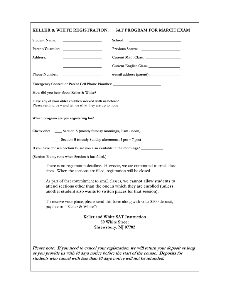 KELLER & WHITE REGISTRATION: Student Name: SAT PROGRAM FOR MARCH EXAM School: Parent/Guardian: Previous Scores:Address: Current Math Class: Current English Class: email address (parent): Phone Number: