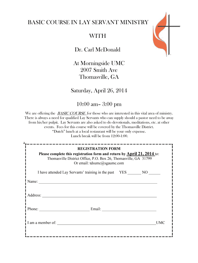 BASIC COURSE IN LAY SERVANT MINISTRY WITH Dr. Carl McDonald At Morning side UMC 2007 Smith Ave Thomasville, GA Saturday, April 26, 2014 10:00 am 3:00 pm We are offering the BASIC COURSE for those