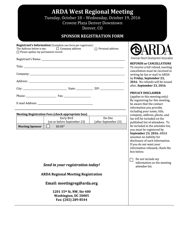 AREA West Regional Meeting Tuesday, October 18 Wednesday, October 19, 2016, Crown Plaza Denver Downtown Denver, CO SPONSOR REGISTRATION FORMRegistrants Information (Complete one form per registrant.)