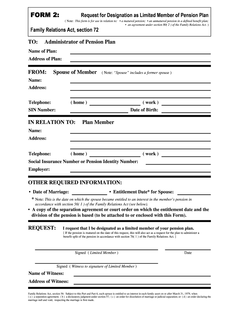 This form is typically necessary for individuals who have an ongoing pension plan, including those involved in section 80(2) of the Family Relations Act. It is essential to complete this form during significant life events, such as marriage or common-law partnerships, to protect the rights of a spouse concerning pension benefits.