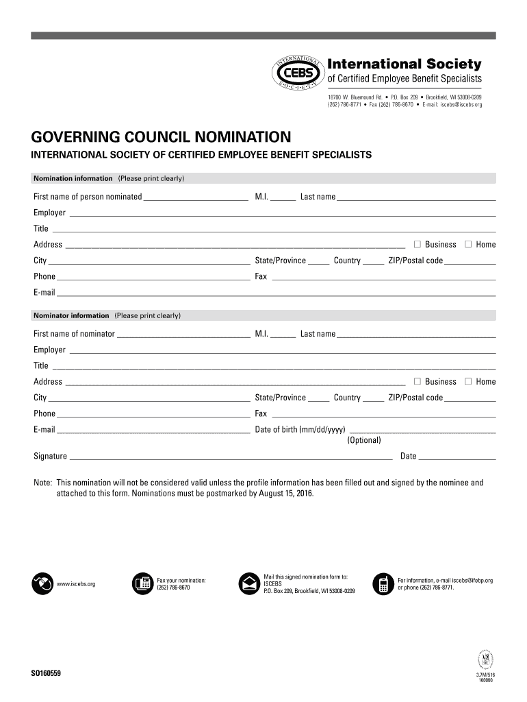 GOVERNING COUNCIL NOMINATION INTERNATIONAL SOCIETY OF CERTIFIED EMPLOYEE BENEFIT SPECIALISTS Nomination information (Please print clearly)First name of person nominated M.I. Last name Employer Title
