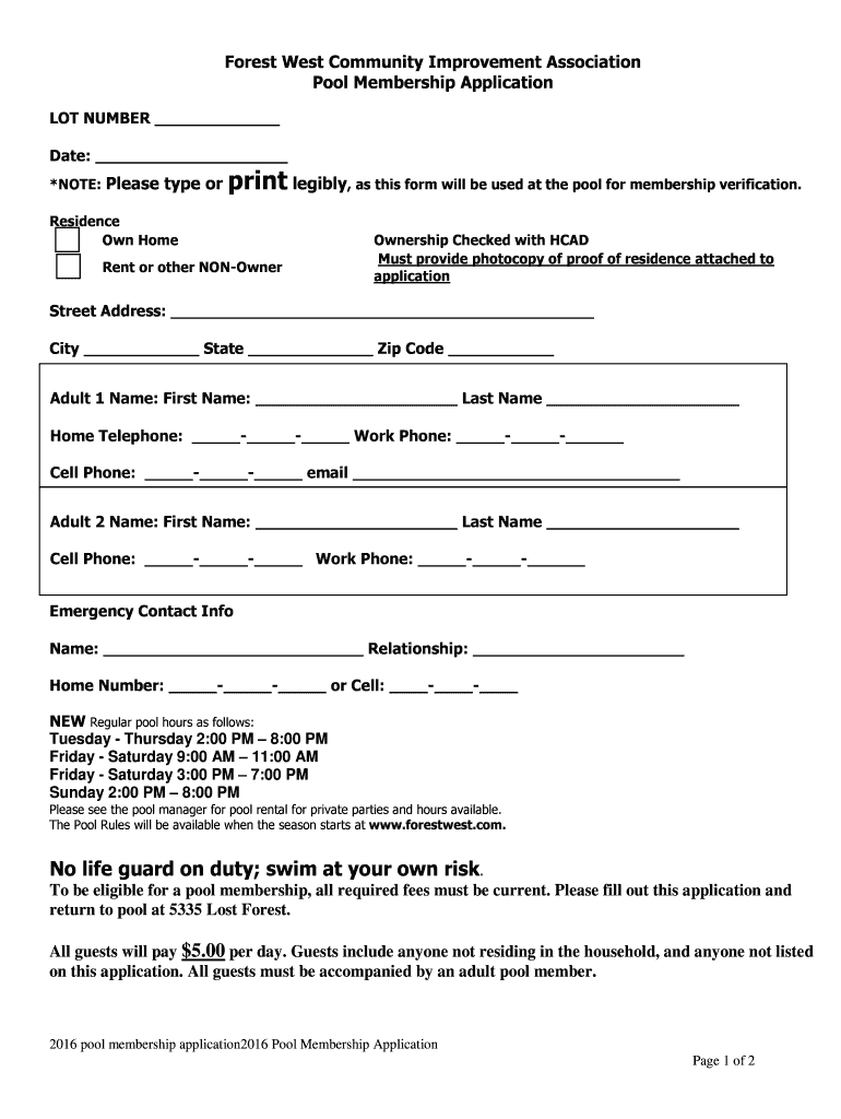 Forest West Community Improvement Association Pool Membership Application LOT NUMBER Date: *NOTE:Please type or print legibly, as this form will be used at the pool for membership verification. Residence