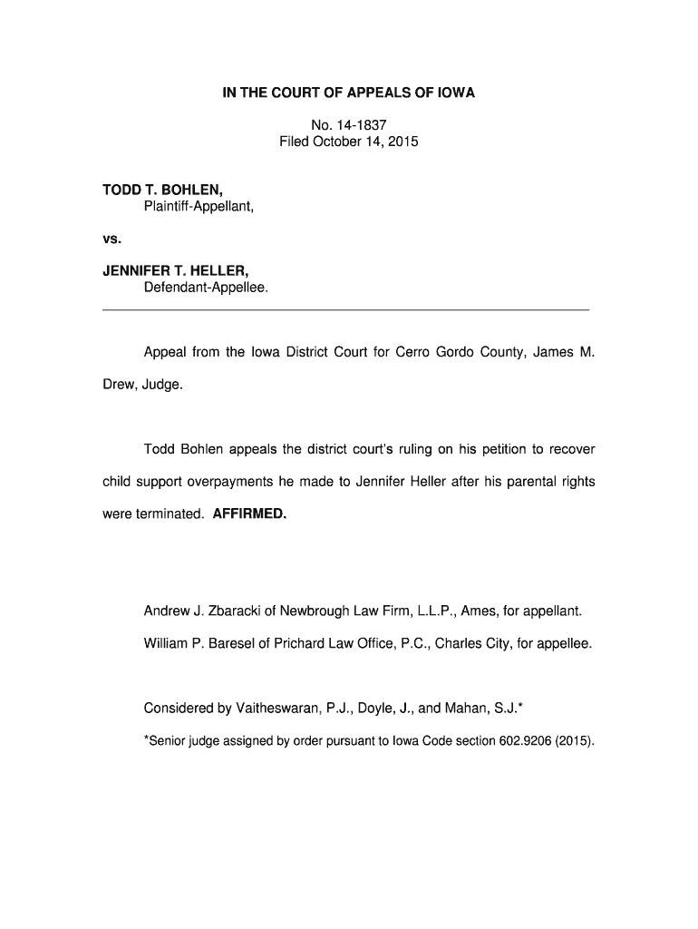 IN THE COURT OF APPEALS OF IOWA No. 141837 Filed October 14, 2015TODD T. BOWLER, PlaintiffAppellant, vs. JENNIFER T. HELLER, DefendantAppellee. Appeal from the Iowa District Court for Cerro Gordon