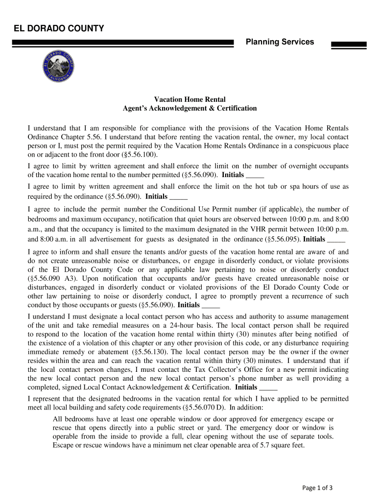 EL DORADO COUNTY Planning ServicesVacation Home Rental Agents Acknowledgement & Certification I understand that I am responsible for compliance with the provisions of the Vacation Home Rentals Ordinance