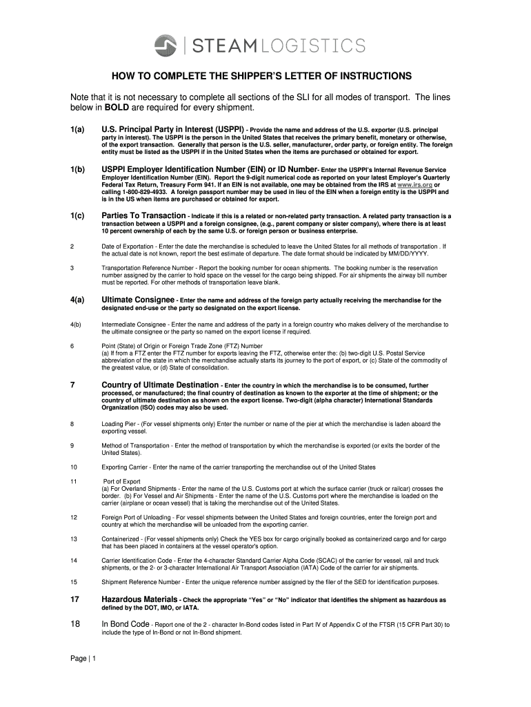 HOW TO COMPLETE THE SHIPPER S LETTER OF INSTRUCTIONS Note that it is not necessary to complete all sections of the SLI for all modes of transport. The lines below in BOLD are required for every shipment.