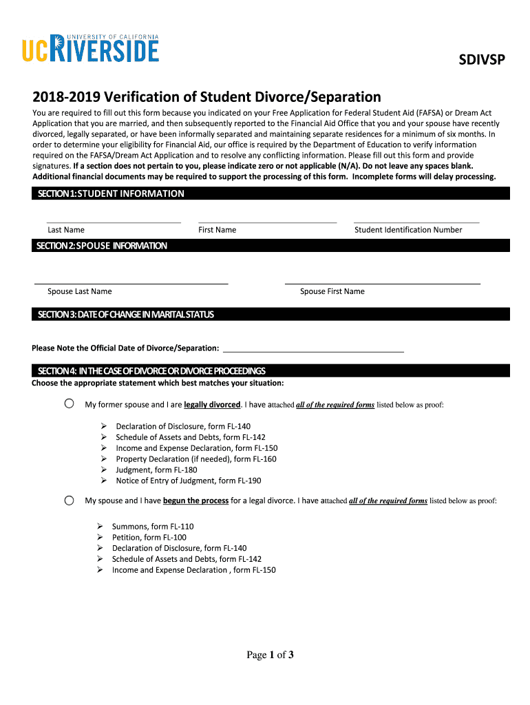 20182019 Verification of Student Divorce/Separation are required to fill out this form because you indicated on your Free Application for Federal Student Aid (FAFSA) or Dream Act