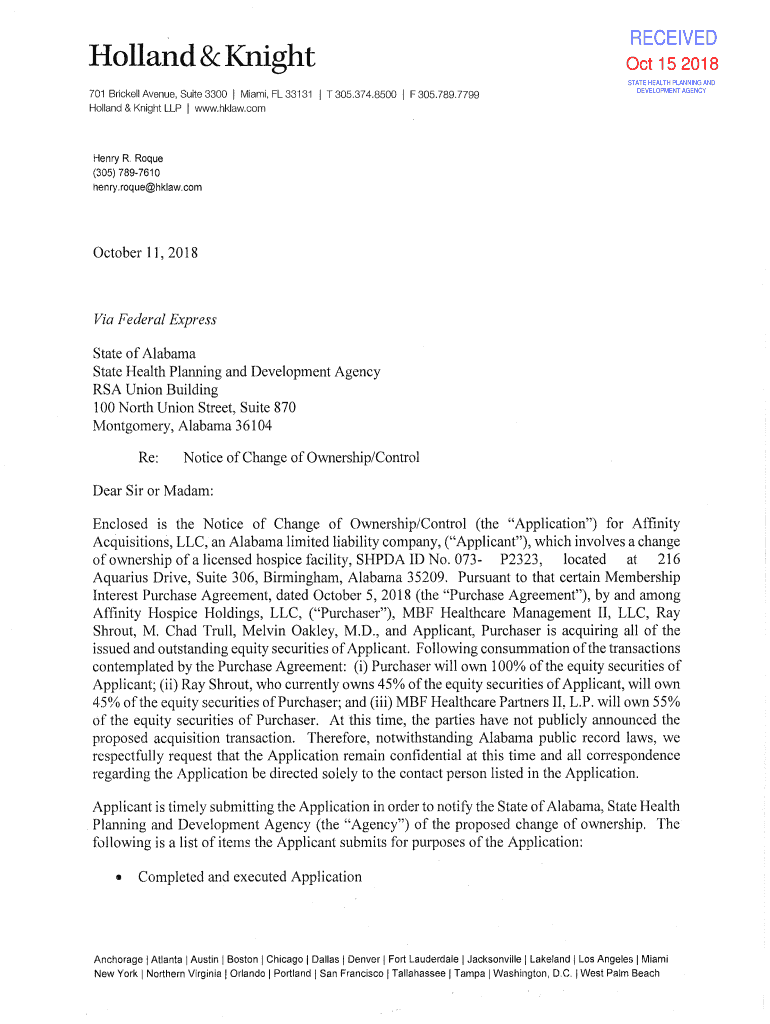 RECEIVED Holland & Knight 701 Brick ell Avenue, Suite 3300 I Miami, FL 33131 Holland & Knight LLP I www.hklaw.comBLW2018 Oct 15 I T 305.374.8500 I F 305.789.7799STATE HEALTH PLANNING AND DEVELOPMENT
