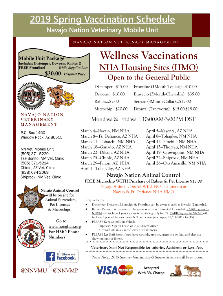 2019 Spring Vaccination Schedule Navajo Nation Veterinary Mobile Unit NAVAJO NATION VETERINARY MANAGEMENT Mobile Unit Package Includes: Distemper, Deform, Rabies & FREE Frontline! While Supplies Last×30.00Original