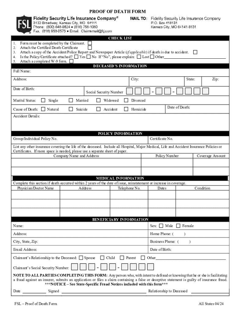 Fidelity Security Life Insurance Company Proof of Death Form 2024-2026 free printable template