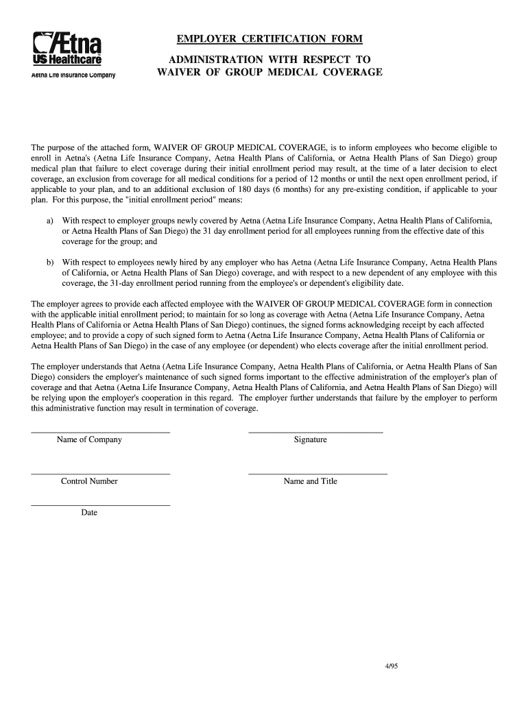 EMPLOYER CERTIFICATION FORM Aetna Life Insurance Company ADMINISTRATION WITH RESPECT TO WAIVER OF GROUP MEDICAL COVERAGE The purpose of the attached form, WAIVER OF GROUP MEDICAL COVERAGE, is to inform